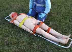 - Finalmente nos aseguraremos de que los cierres que juntan las dos partes se encuentran bien asegurados antes de mover y elevar le camilla con el accidentado. Si no lo hacemos así, tendremos el riesgo de dejar caer al accidentado al levantarlo. La camilla tiene muy buena estabilidad para los accidentados pero es obligatorio asegurarlo con el correspondiente juego de correas de fijación que hallaremos para tal efecto.