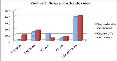 La gráfica 5 muestra que 39.5% y 41% respectivamente de los alumnos por año escolar reportaron vivir en el Estado de México.