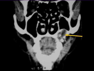 Figura No 2. Hallazgos del corte coronal de la TAC señalado por la flecha