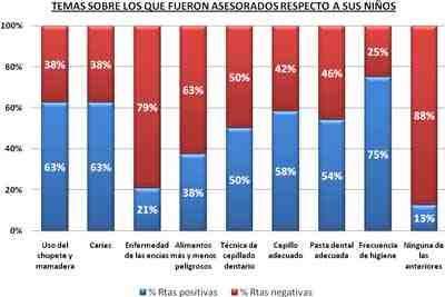 En segundo lugar los temas más abordados con anterioridad fueron el Uso del chupete y la mamadera, y la enfermedad de caries, donde el 63% afirmó haber recibido información al respecto.