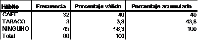 Análisis: Como se observa en la tabla 36, más de la mitad de los beneficiarios no consumen productos que pudieran afectar a su salud, el 40% consumen café y una minoría (3,8%), consume tabaco, es importante abolir por completo el tabaquismo, ya que aumenta al doble la posibilidad de eventos cerebrovasculares y mayor aun si va acompañado de hipertensión arterial (HTA) (Estudio Interheart, 2008).