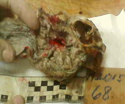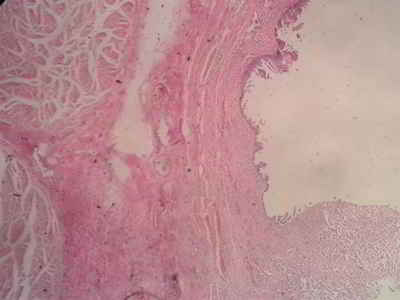 En la imagen uno se puede observar la fistula traqueo esofágica, y en la número dos imagen microscópica compatible con carcinoma epidermoide moderadamente diferenciado.