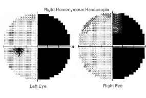 El estudio campimétricos fue completamente anormal pues se detectó una pérdida del campo temporal del ojo derecho y nasal del ojo izquierdo, diagnosticándosele hemianopsia homónima derecha y se remite hacia la consulta de neurología.