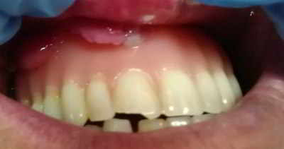 Figura 1. Presentación clínica de un épulis fisurado con la prótesis.