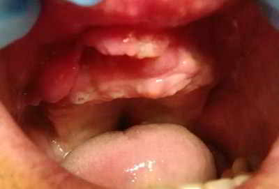 Figura 2. Épulis fisurado y ulceración a nivel del frenillo labial superior.