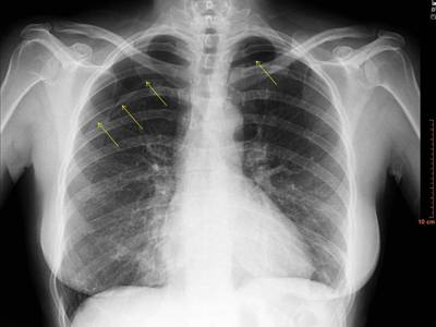 Figura 1: Radiografía de tórax con neumotórax en ápex derecho de aproximadamente un 25% de extensión y neumotórax en fosa supraclavicular izquierda (flechas).