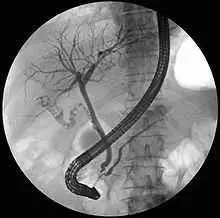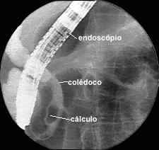 CPRE de un conducto biliar y pancreático anormales; se muestran cálculos de diferentes tamaños en la vesícula biliar y el conducto cístico.
