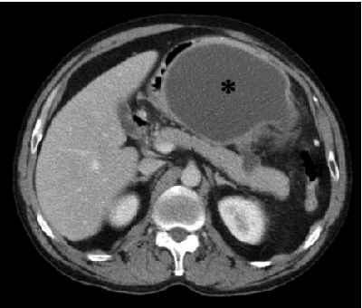 Imagen quística con pared bien definida, con contenido líquido, en el sector anterior del epigastrio (asterisco) y pequeña imagen líquida conectando con la cara anterior del páncreas en el cuerpo.