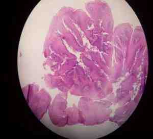 Figura 1: Lesiones polipoideas, vegetantes, aisladas, de superficie irregular, de unos 6 mm de diámetro aproximadamente, que se extienden proximalmente desde el tercio distal cercano a la unión gastroesofágica (UGE).