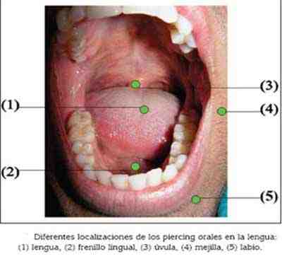 Figura 1: LOCALIZACIONES MÁS FRECUENTES DEL USO DE LOS PIERCINGS EN LA CAVIDAD BUCAL.