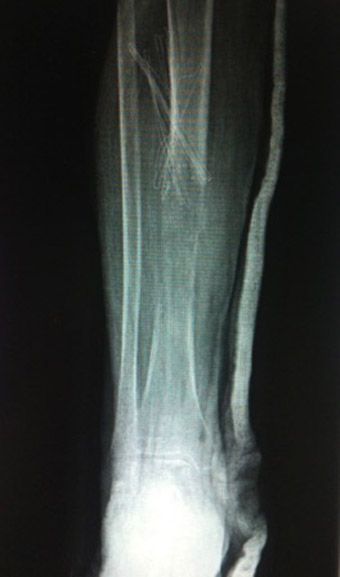 Foto 1. Radiografías anteroposterior y lateral de la tibia, donde se aprecia una fractura patológica del tercio medio/distal de la tibia. Sobre una lesión lítica.