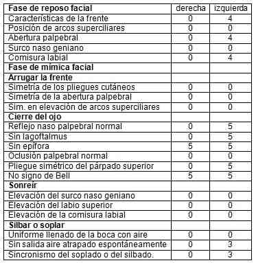 La evaluación facial global realizada inicialmente fue: hemicara derecha 10% (parálisis facial) y en la hemicara izquierda 42% (asimetría facial muy severa)