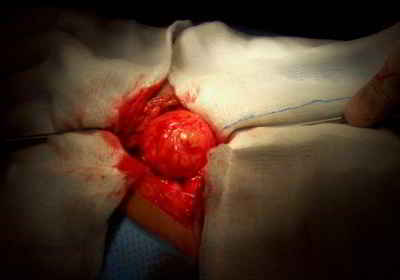 Figura 1. Saco Herniario donde se observa el nódulo color amarillo del tejido adrenal ectópico.