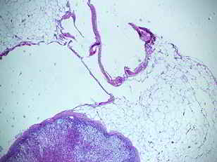 Figura 2 y 3: Cortes Histológicos de H y E. Muestra tejido adrenal organizado detectado en el nódulo resecado del saco herniario.