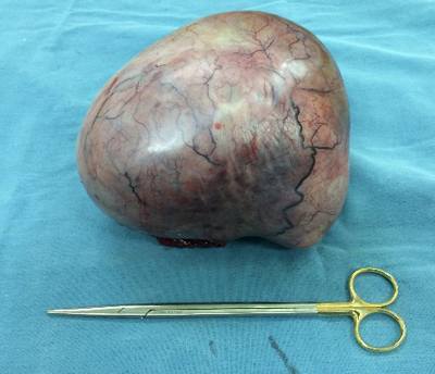 Descripción de histopatología: tumor que pesa 3kg, mide 20x18x16 cm, superficie es de color grisácea, lisa con segmento de salpinge adherido, al corte la consistencia e s blanda, la pared de 0.2 cm de espesor y tiene lesión quística dominante que contiene materia de color rojo oscuro, tiene una lesión quística de 6.5 cm de diámetro que contiene material sebáceo y pelos largos con pequeña zona de 1cm de consistencia arenosa.