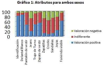 Variables unisex (Gráfico 1): La valoración positiva (Muy buen Médico y Buen Médico) otorgada a la identificación corresponde a un 84% y al uso de delantal blanco un 88%, ambas muy significativas. En cuanto a los pantalones de vestir, la valoración positiva de 48% no difiere mucho de la respuesta indiferente de 50%. El uso de jeans es indiferente para la mayoría de los encuestados 50%.