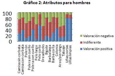 Variables para hombres (Gráfico 2) : El uso de camisa, ya sea sin o con corbata, polerón, polera sin cuello y polera con cuello, tuvieron una respuesta indiferente en su mayoría, 50%, 44%, 53%, 54% y 44% respectivamente. El pelo largo y dreadlocks tienen muy baja valoración positiva, con un 8% y 6% respectivamente, en contraste al pelo corto con un 56%.