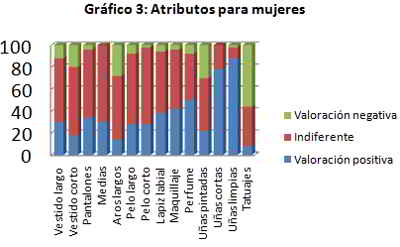 Variables para mujeres (Gráfico 3): En relación al uso de vestido largo y corto en ambos prima la indiferencia con uno 58% y 62% respectivamente y son valorados positivamente con un 30% y 18%. Con los pantalones, estos fueron considerados indiferentes en un 62%. Las medias no tuvieron connotación negativa en ningún porcentaje. Por otra parte los aros, al igual que muchos otros ítems, fueron catalogados como indiferentes en un 58% y luego tuvieron valorización negativa en un 28% no siendo muy significativa con la positiva.